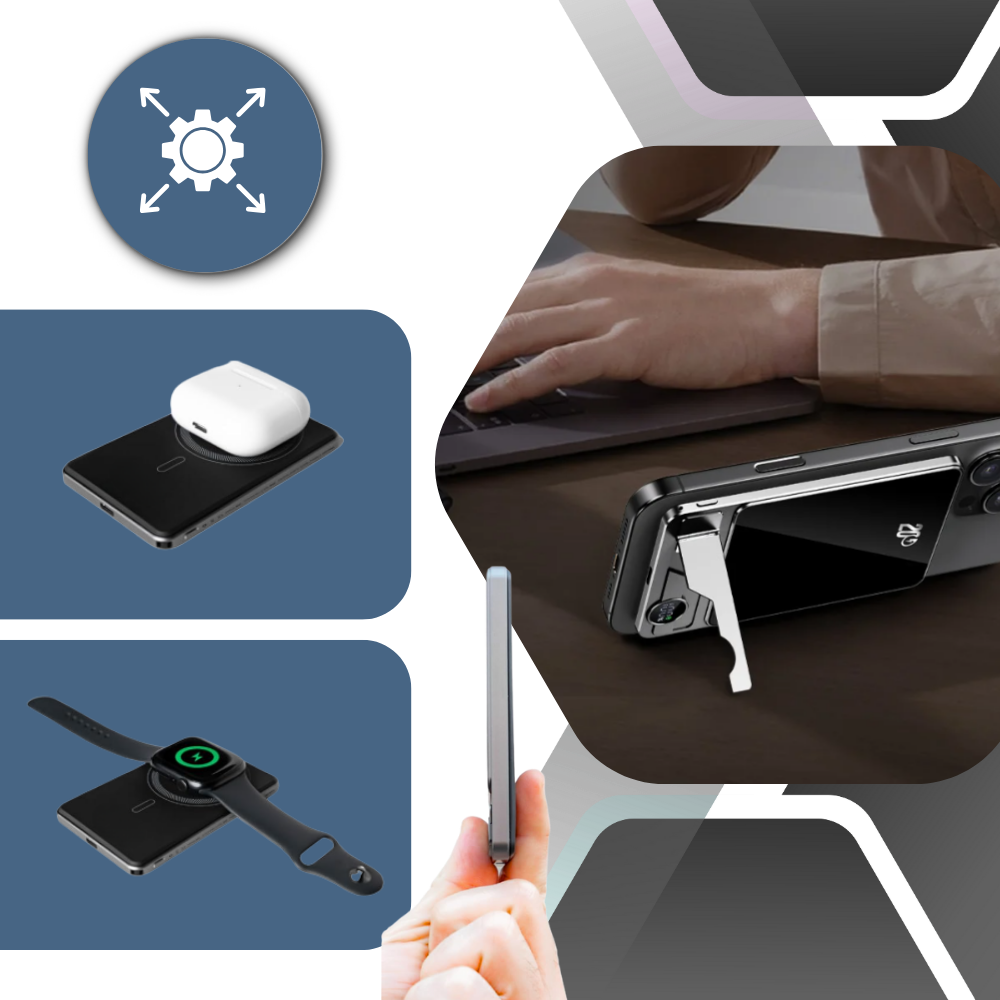 La fonctionnalité rencontre l'esthétique avec le support pliable, qui vous permet de maintenir votre téléphone en mode paysage ou portrait pendant qu'il se recharge. Que vous passiez un appel vidéo, regardiez Netflix ou lisiez les actualités, vous bénéficiez d'une commodité mains libres et d'une alimentation sans fil continue. Lorsqu'il n'est pas utilisé, le support se replie à plat, préservant ainsi le profil compact de la batterie externe. Elle est idéale pour une utilisation quotidienne, pour les voyages ou les configurations de bureau.
