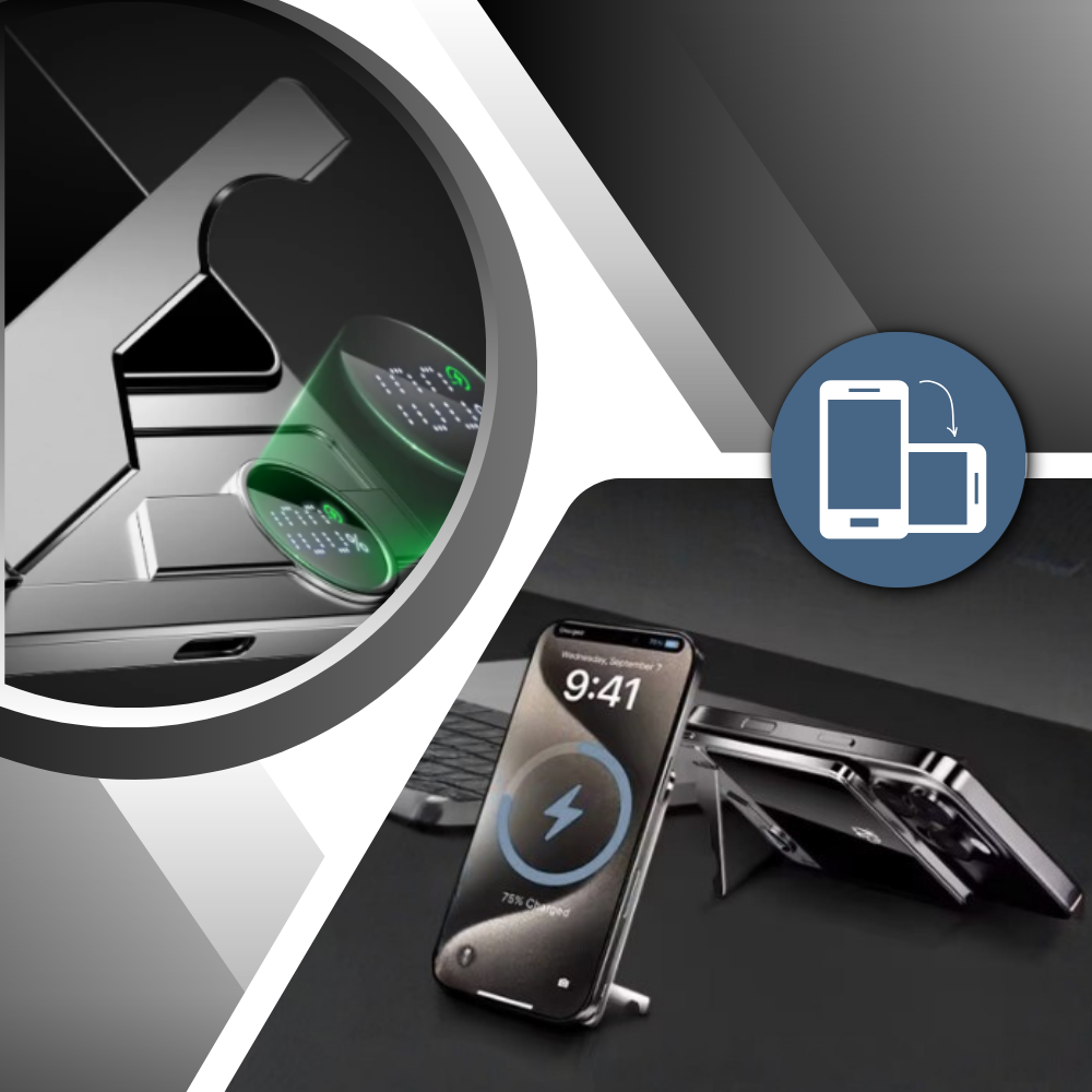 Dites adieu aux câbles emmêlés et aux positions de recharge inconfortables. Grâce à sa fonction avancée Magnetic Snap-On, ce chargeur se fixe parfaitement aux appareils compatibles MagSafe à l'aide d'un ensemble puissant de 18 aimants en néodyme de haute qualité. L'alignement précis garantit une connexion stable et une efficacité de recharge optimale à chaque fois. Grâce à l'induction automatique, le chargement commence instantanément au contact , sans bouton, sans approximation. Que vous soyez en déplacement, en train de multitâcher ou de vous détendre, votre appareil reste solidement fixé et alimenté, vous offrant un chargement sans fil sans effort et en toute tranquillité.