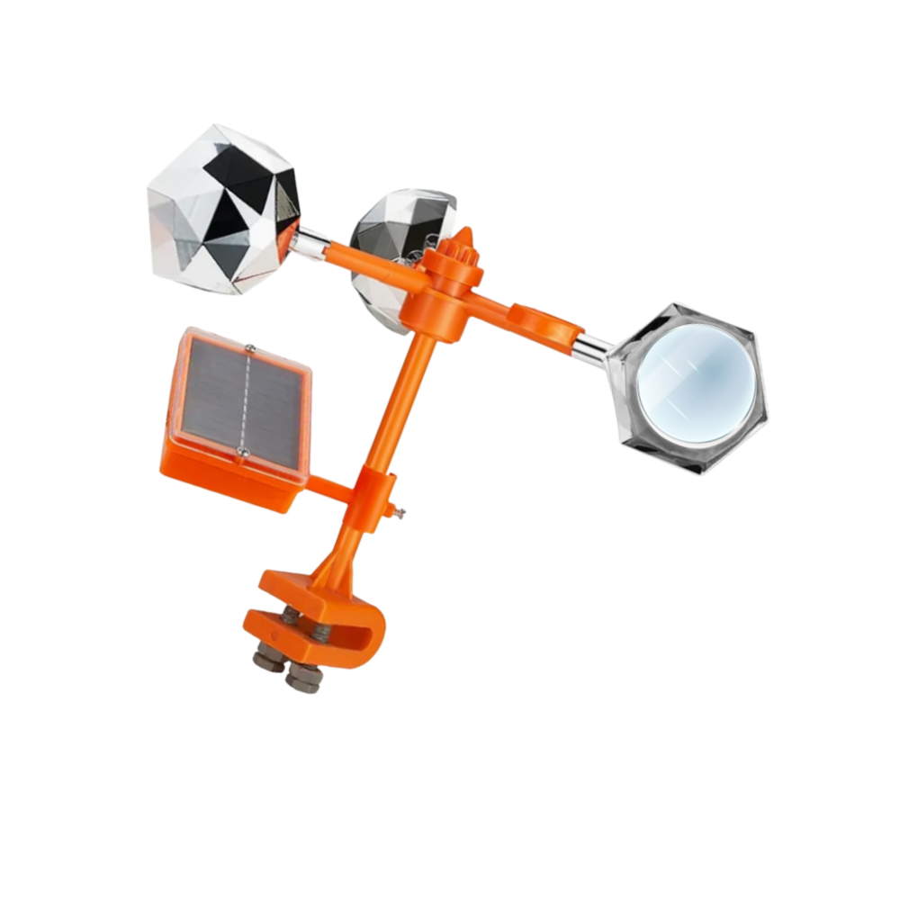 Les oiseaux n'aiment pas les éclairs de lumière soudaine, et c'est là qu'entre en jeu le système réfléchissant de ce répulsif. Grâce à des panneaux réfléchissants de 72 mm stratégiquement positionnés, cet appareil utilise la lumière du jour pour diffuser des flashs scintillants dans toutes les directions. Ces éclairs désorientent les oiseaux, perturbent leur trajectoire de vol et rendent votre espace dangereux pour eux. Les angles et les reflets changeants sont particulièrement efficaces par temps ensoleillé et sur de vastes zones, telles que les fermes et les vignobles. Il s'agit d'un moyen de dissuasion propre et sans produits chimiques qui exploite un principe fondamental de la nature, c'est à dire la lumière comme moyen de défense, tout en ajoutant un élément visuel saisissant à votre paysage.