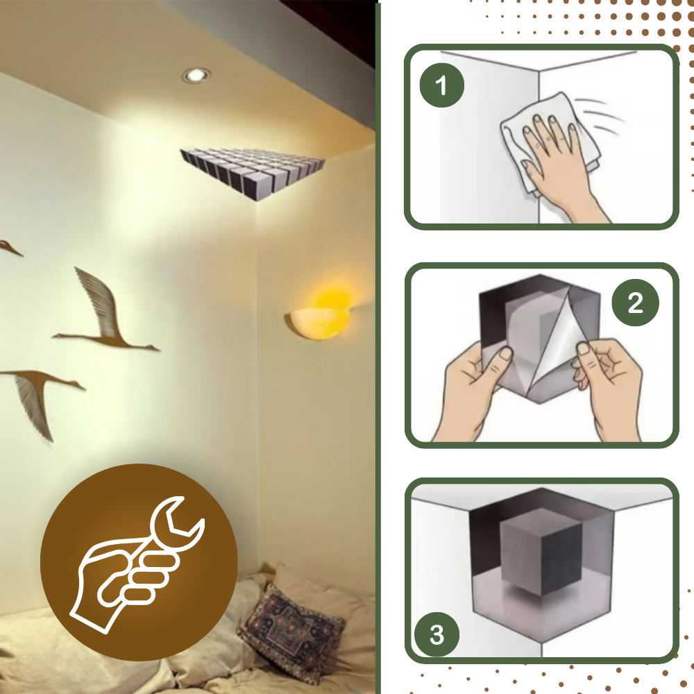 Il n'y a rien de plus satisfaisant qu'une décoration attrayante qui vous fait y regarder à deux fois. L'effet d'illusion 3D conçu avec précision crée une profondeur et une dimension réalistes, transformant un coin de mur plat en ce qui semble être un cube flottant suspendu dans l'espace. Il joue avec la lumière, les ombres et la géométrie pour susciter la curiosité et la surprise. Chaque regard devient une subtile expérience de découverte, ajoutant énergie et créativité à votre environnement sans le surcharger. Ce n’est pas seulement un impact visuel, mais l'effet de surprise de voir votre espace prendre vie.